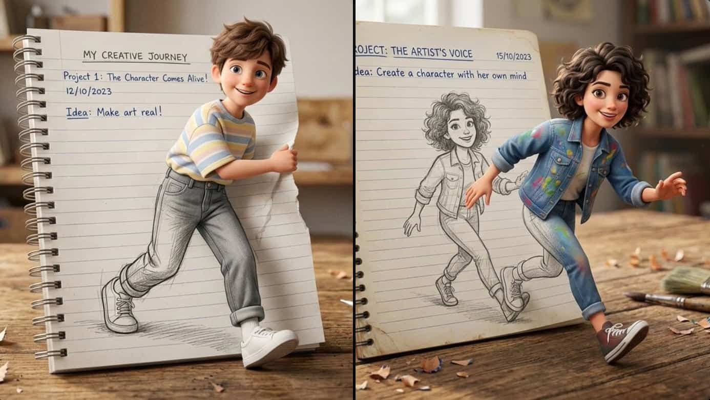 "prompt": "A creative 3D illusion artwork of a cute young boy stepping out of a spiral notebook page placed on a wooden desk. The notebook has lined paper with handwritten text at the top. The boy appears in a semi-realistic 3D cartoon style, with soft messy brown hair, natural fresh face, and a cheerful smile. He is wearing a pastel oversized t-shirt, high-waisted light grey jeans, and clean white sneakers. His lower body is sketched in pencil on the notebook page, while his upper body looks fully realistic and popping out of the paper, creating a striking 3D illusion effect. Warm soft lighting, detailed wooden desk texture, shallow depth of field, ultra-detailed, high resolution.",