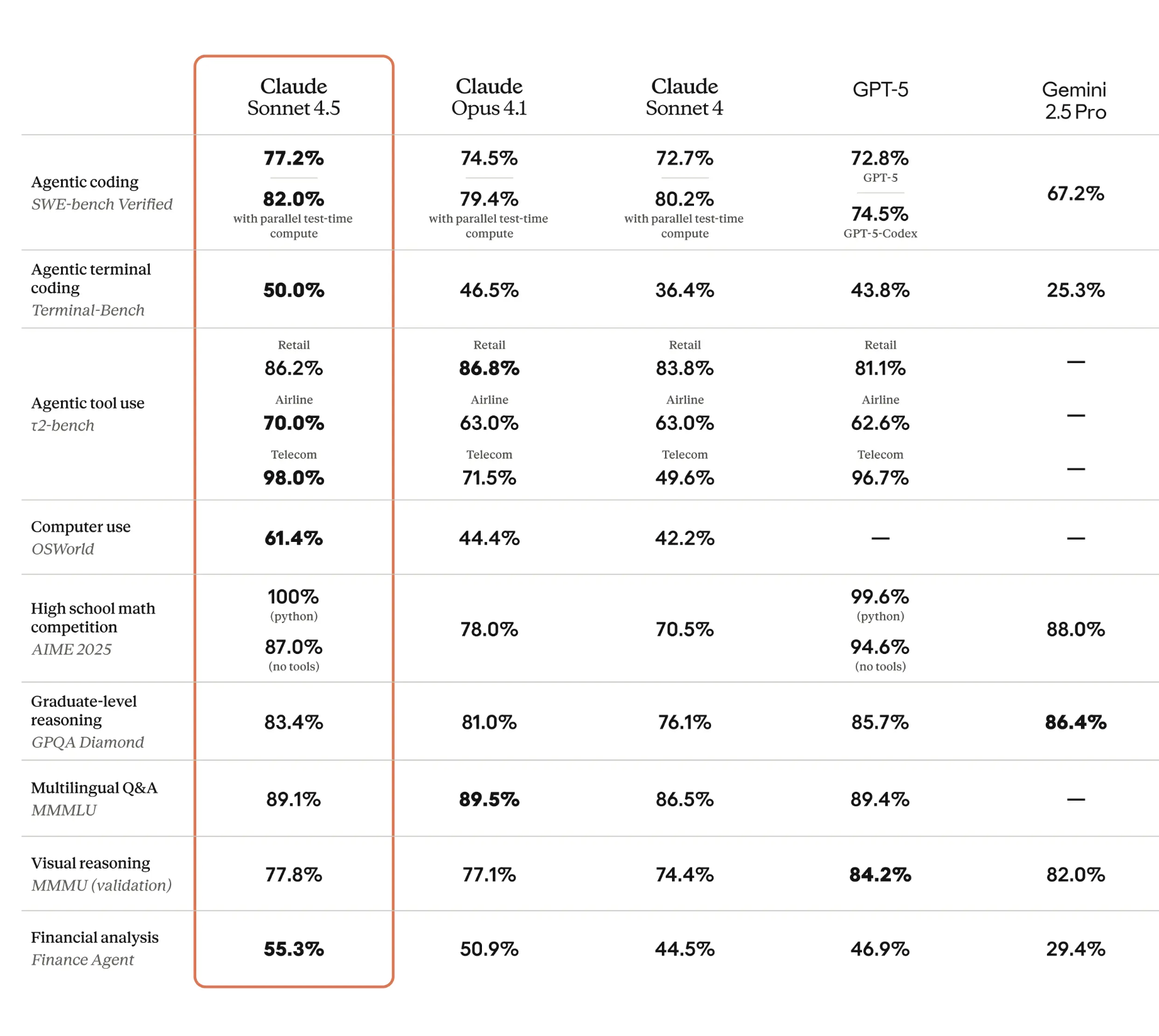 Claude Sonnet 4.5 već se naziva „najboljim modelom za kodiranje na svijetu“. Na SWE-bench Verified testu ostvario je najbolje rezultate, dok na OSWorld benchmarku vodi sa 61,4% uspješnosti što je skok sa 42,2% u odnosu na prethodnu verziju Sonnet 4.