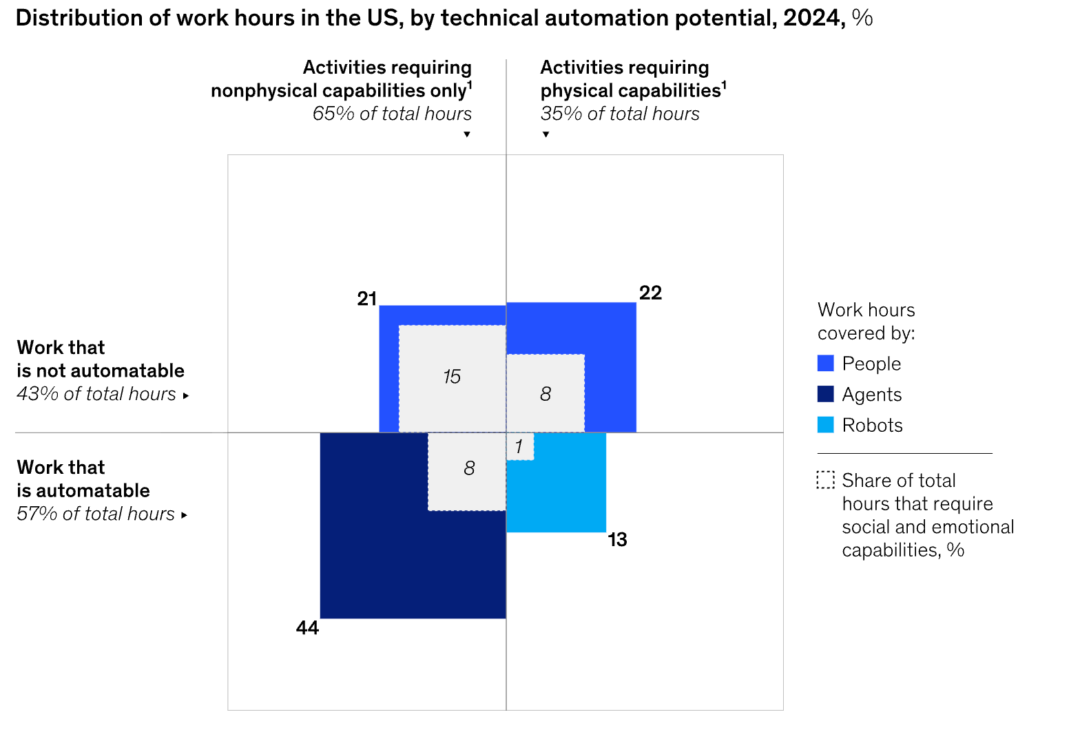 Najnoviji, opsežni izvještaj McKinsey Global Institute otkriva da bi trenutno dostupne tehnologije posebno generativna AI i agenti mogle tehnički automatizovati 57% ukupnih radnih sati u SAD-u. Ali uprkos alarmantnom tonu, izvještaj ne predviđa masovna otpuštanja, već duboku promjenu u načinima rada. Buduće tržište rada, kažu istraživači, neće biti bitka ljudi protiv mašina već partnerstvo ljudi, agenata i robota.